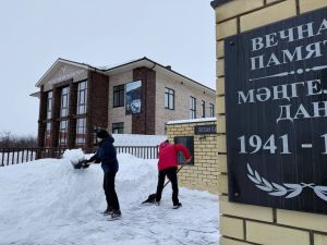 Школьники очистили от снега обелиск в Тенишево